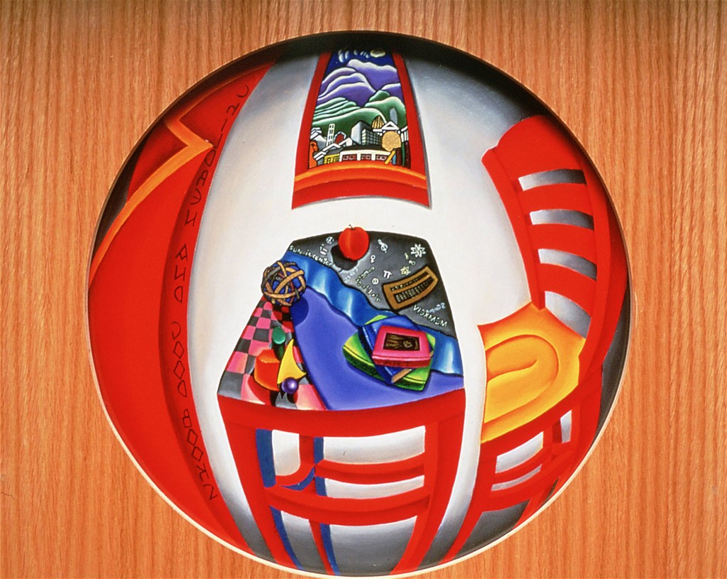 Oil and Mixed Media on Wood 6 feet by 7 feet by 20 inches and 12 inch medallion.