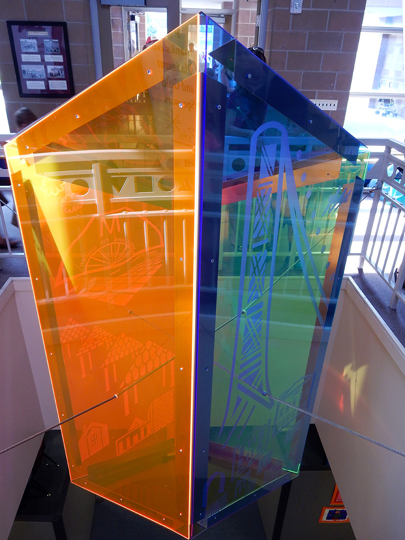 The sculpture is an elongated cube suspended in the open space between two floors in the school’s entry. Third grade students toured Golden. They photographed and drew their favorite images. The drawings of their favorite shapes in Golden are fused onto the plexiglas. While walking around the sculpture the transparent colors of the plexiglas appear to mix, perpetually changing the Shapes of Golden.