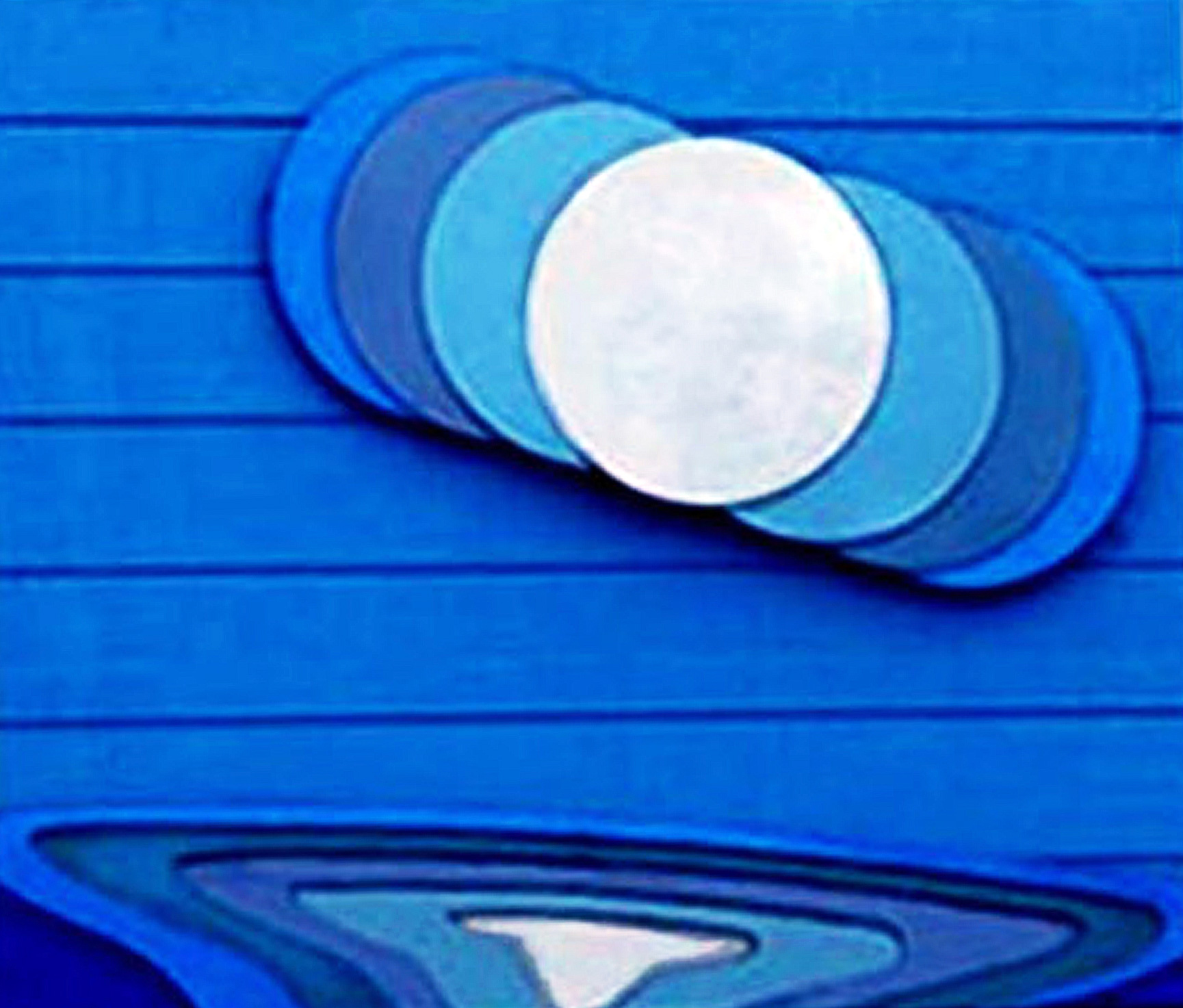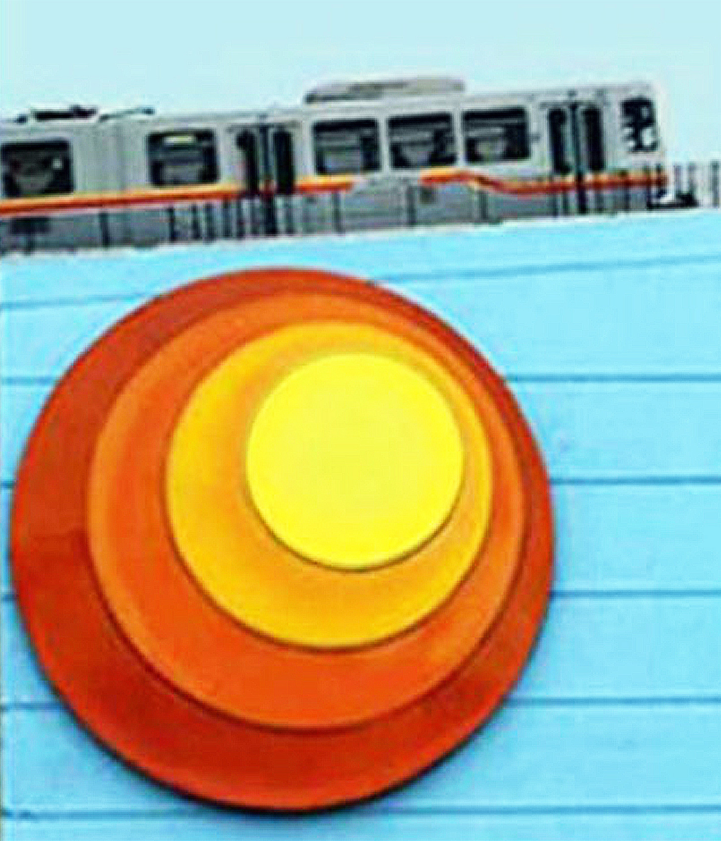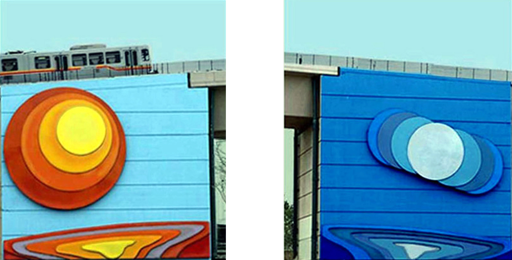 Walls of a flyover for the Light Rail System for Metropolitan Denver. The image suggests the ultimate travel system of our world: The orbit of the Earth, and the moon, the Earth’s rotation around the sun. On the left the Earth travels around the sun over a warm convex daytime landscape. On the right the moon travels around the Earth in the cool nighttime, over the ocean on a concave surface.